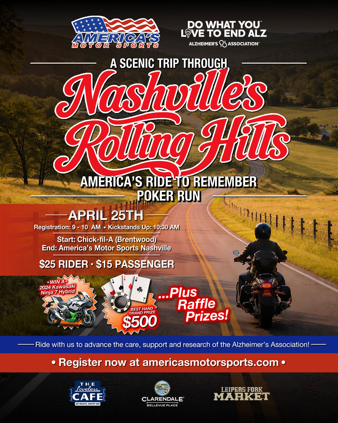 Join riders from across Middle Tennessee for the 2nd Annual America’s Ride to Remember Poker Run on April 25, 2026, a scenic charity ride through the rolling hills south of Nashville supporting the fight against Alzheimer’s. This unforgettable day blends beautiful roads, great company, and meaningful impact, all culminating in prizes, community, and celebration.